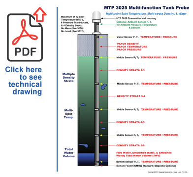 The MTP 3025 provides Multi-point spot temperature, Multi-strata density, and Total Water. Designed for superior inventory measurement when paired with level technology (Radar, Servo, Magnetostrictive, etc.).
