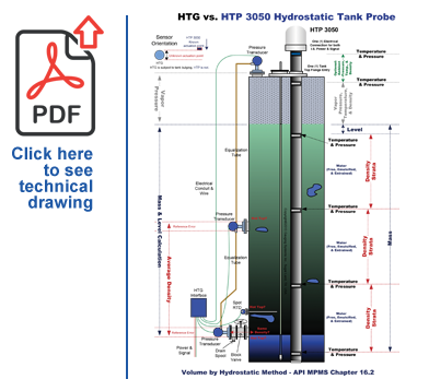 HTP 3050 is the proper way Hydrostatic Tank Gauges should have been engineered and designed back in 1980 moving forward. Provides Mass, Spot temperatures, and Density. A Hydrostatic Tank Probe that uses five absolute pressure transducers and Class A, 100 Ohm Platinum, Four-wire RTD’s installed within a bottom referenced probe. The HTP 3050 probe is installed from the top of the tank and magnetically coupled to the bottom or datum plate; no hot taps, valves, heat trace or tubing; Eliminates all common HTG errors due to physical design and installation, i.e., only one reference density, level inaccuracy, outside wall mounting transducers causing errors, calibration frequency, etc.