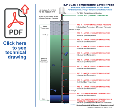 Approximate Level given by three Pressure Transducers (bottom, middle, and vapor) and wetted RTD selection for Average Temperature or Multi-point spot Temperature. Multi-point spot temperature probe using Class A or DIN, 100 Ohm Platinum, Four wire RTD’s. Six – twelve per TTP, based upon tank height.