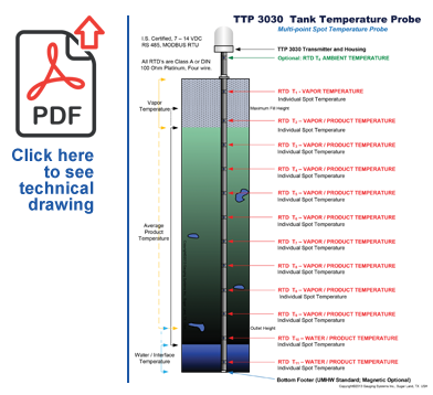 Multi-point spot temperature probe using Class A, 100 Ohm Platinum, Four-wire RTD’s.  Six – Twelve per TTP, based upon tank height.
